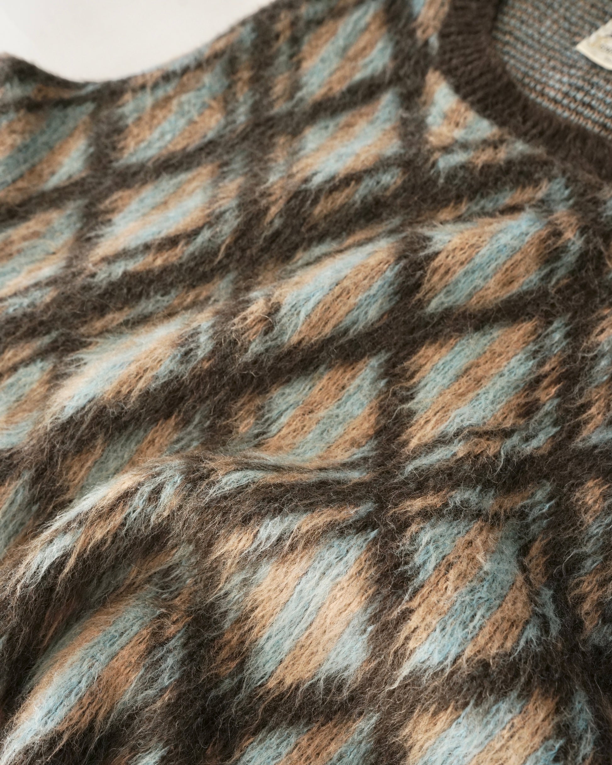 アーガイル×ストライプの柄に毛足の長いニット。